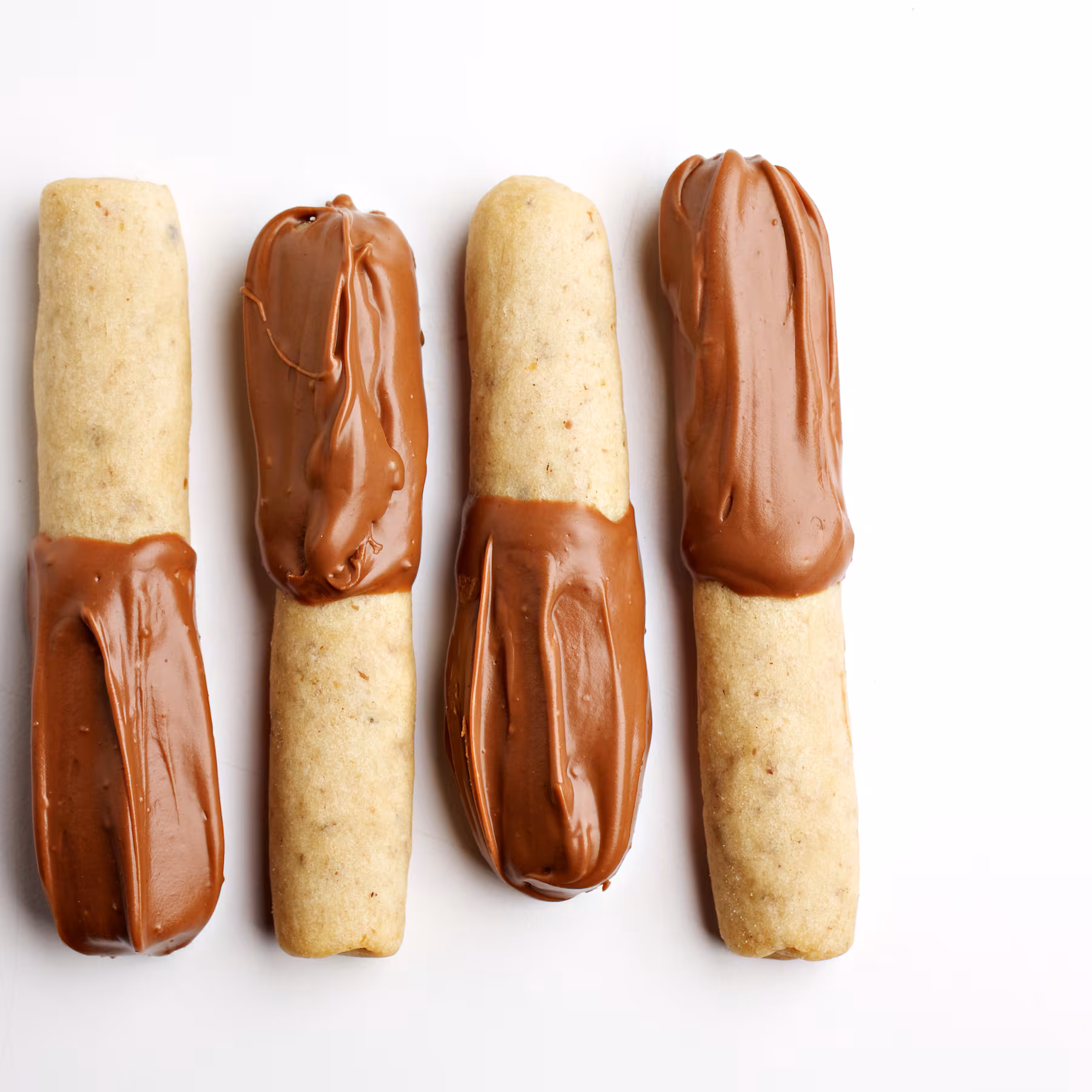 Montagem: Dispor os rectângulos de bolo sobre uma grade de pastelaria, com um tabuleiro por baixo (para escorrer o chocolate). Fazer cilindros de castanha por cima do bolo, no sentido do comprimento. Cobrir com o brilho de chocolate, banhando generosamente os rectângulos com uma concha de sopa e deixando-os escorrer sobre a grade. Refrigerar ou congelar, para que seja mais fácil “transportar” os rectângulos para um prato.