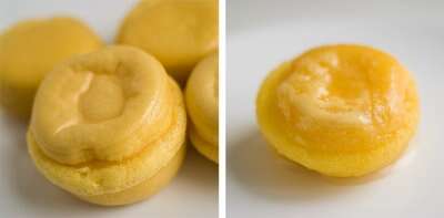 Pré-aquecer o forno a 180ºC. Untar 20 forminhas. Bater as gemas e o ovo até que aumentem de volume. Juntar a maizena peneirada com o fermento e continuar a bater. Encher as formas e cozer uns 10 minutos.