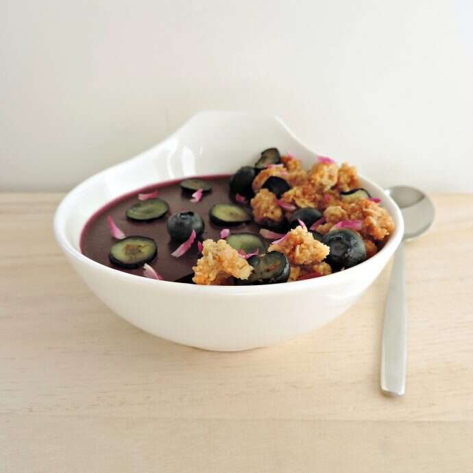 Servir as panna cottas frias, com o crumble e mirtilos.
