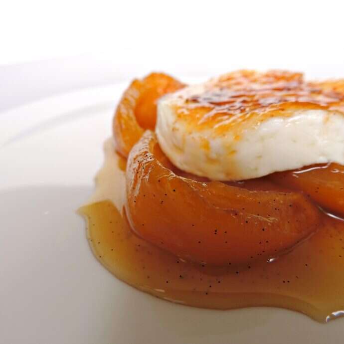 Nêsperas em Calda de Whisky e Baunilha com Queijo Fresco Caramelizado.